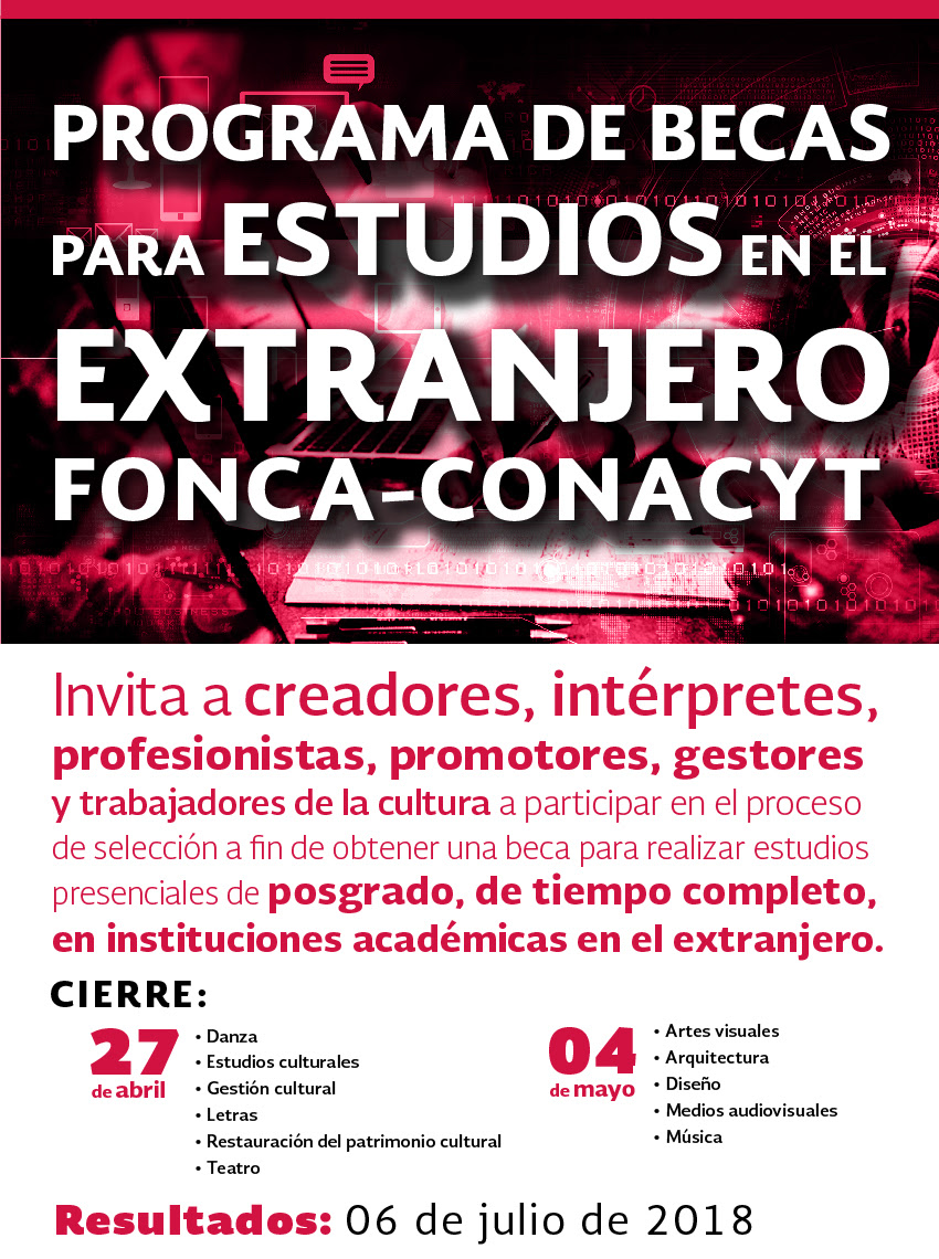 Para impulsar y fortalecer la educación y la investigación artística y cultural de calidad, así como formar investigadores y especialistas de alto nivel y excelencia en las diversas disciplinas artísticas, en colaboración con el Consejo Nacional de Ciencia y Tecnología (Conacyt), se convoca a los creadores, intérpretes, profesionistas, promotores, gestores y trabajadores de la cultura a participar en el proceso de selección a fin de obtener una beca para realizar estudios presenciales de tiempo completo de posgrado, en instituciones académicas en el extranjero.