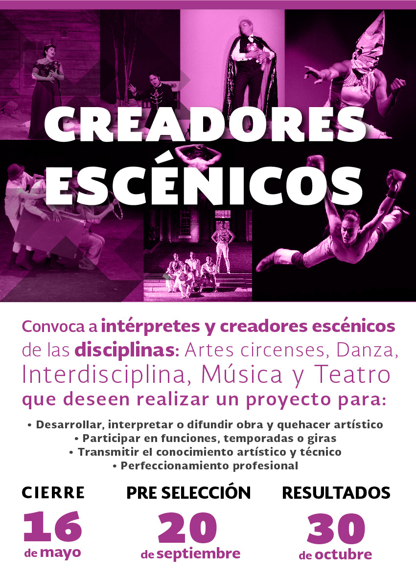 Las categorías de esta convocatoria son Creador escénico en formación, Creador escénico A, Creador escénico B, Creador escénico con trayectoria, y las disciplinas: teatro, música, danza, artes circenses e interdisciplina. La fecha de cierre es el 16 de mayo de 2018.