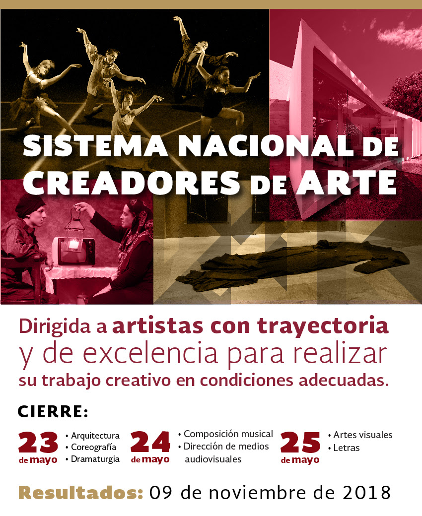 Las disciplinas participantes son Arquitectura, Artes visuales, Composición musical, Coreografía, Dirección en medios audiovisuales, Dramaturgia, Letras y Letras en lenguas indígenas. Fechas de cierre: 23, 24 y 25 de mayo de 2018, según la disciplina.