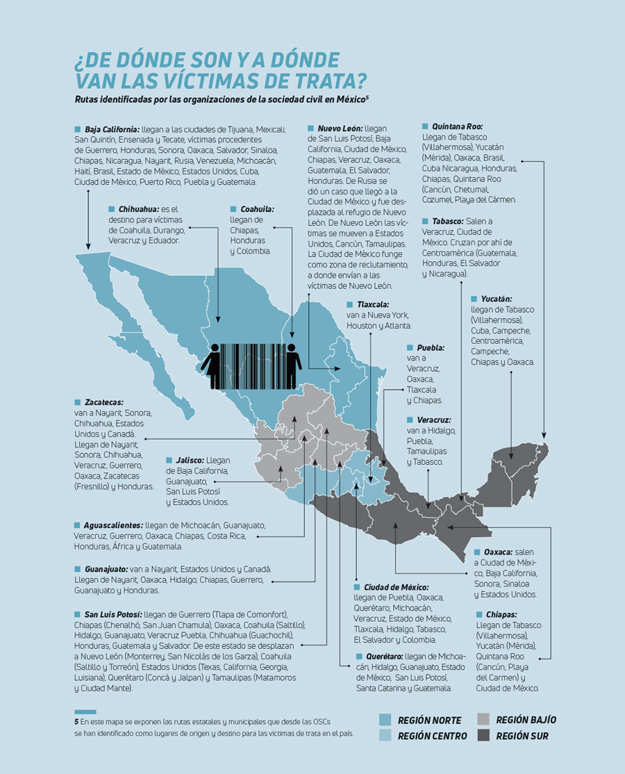 Así mismo realiza un mapeo de México por zonas geográficas donde se muestra de dónde son y a dónde van las víctimas de trata. Para descargar el estudio completo consulta telcel