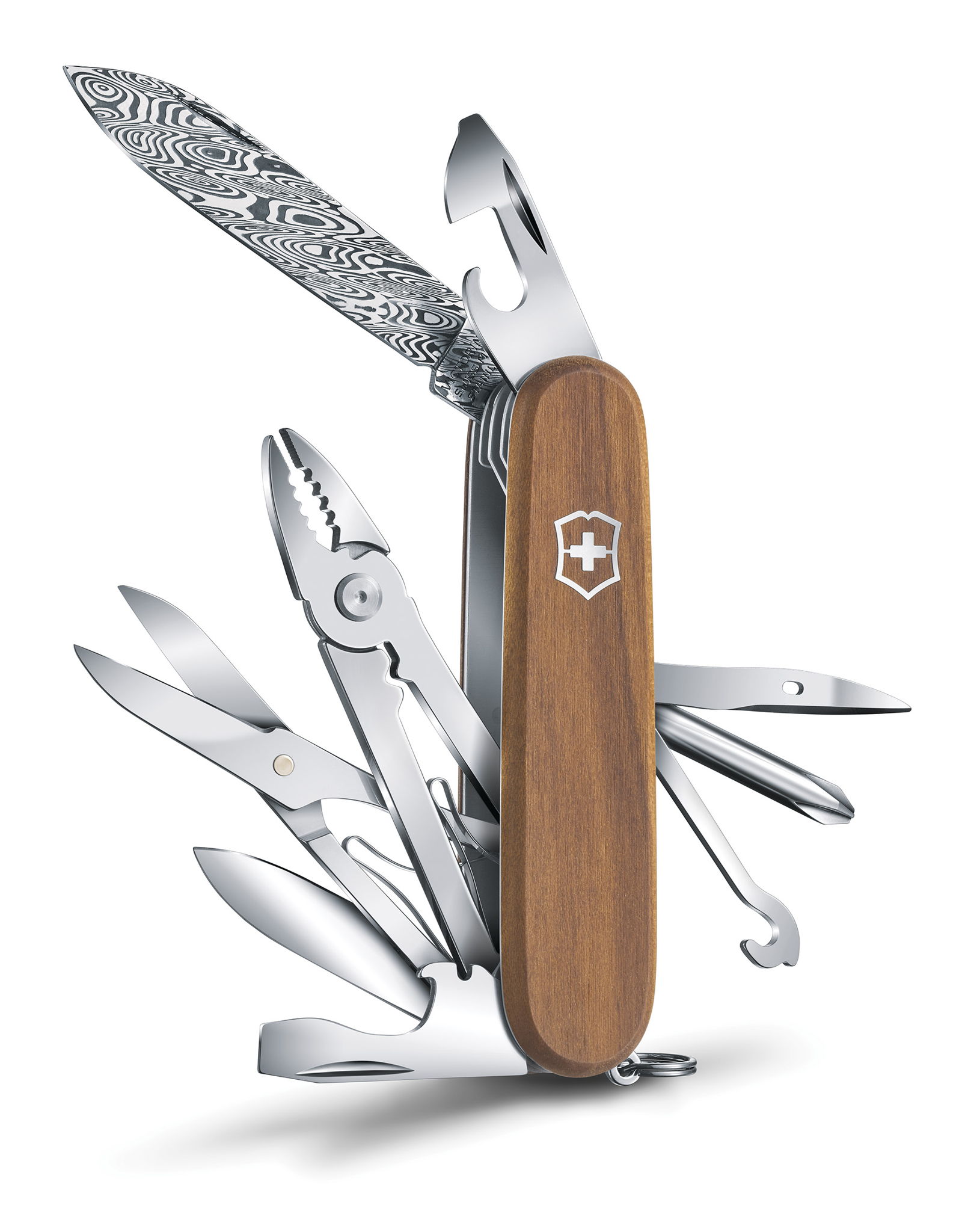 punzón escariador, tijeras de precisión y alicate multiuso.A diferencia de la edición estándar, la hoja grande de la Victorinox Deluxe Tinker Damast Limited Edition 2018, sigue la tradición de estar elaborada con el acero de Damasco de la mejor calidad. Se utiliza un procedimiento técnicamente complejo para forjar el acero de Damasco (DS93X™) que está compuesto por las aleaciones de acero RWL-34™ y PMC-27™. El impresionante diseño de “Ladder” (escalera) del acero Damasco se compone de un total de 333 capas forjadas.