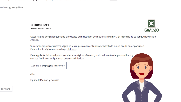 1. Gayosso envía al correo electrónico designando un acceso, sólo se tiene que dar clic en el botón "Acceso a su página InMemori"