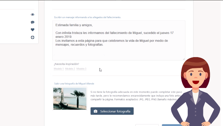 2. Editar los datos del Ser Querido, aquí se podrá escribir un mensaje informando a los familiares y amigos, además se podrá agregar una fotografía y/o usar uno de los textos sugeridos.
