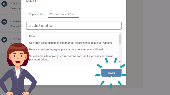5. Se podrá enviar el link a través de WhatsApp, redes sociales o correo electrónico. Únicamente las personas que reciban esta liga tendrán acceso a la página para compartir mensajes de apoyo, subir fotos en honor al Ser Querido, además de conocer los detalles del servicio funerario.