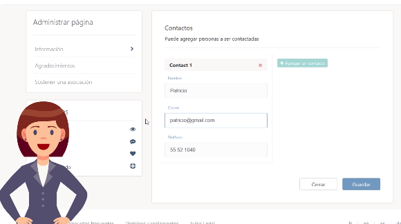 4. Informar quién será el contacto para que los familiares y/o amigos se comuniquen en caso de dudas, además se podrán agregar a más administradores para que editen en la plataforma.
