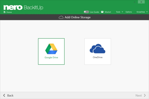 Poner a salvo tus datos más preciados en la nube con Nero BackItUp es muy sencillo y solo requiere de 3 rápidos pasos:PASO 1: SELECCIONAR COPIA EN LÍNEAPara comenzar basta con hacer un clic en la opción “Hacer copia de seguridad ahora” y a continuación seleccionar la opción de copia en línea, donde deberemos especificar si nuestro destino es OneDrive o Google Drive. Es necesario iniciar sesión en el servicio elegido y aceptar los permisos requeridos.