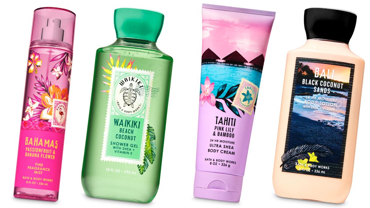 - Bahamas Pink Passionfruit & Banana Flower: hecha con vitamina E, aloe, maracuyá, piña, pétalos de fresia, flor de plátano y ámbar, harán que la fragancia tenga un fresco aroma a cóctel tropical.