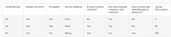 certificados TLS vienen en tres tipos: Validación de dominio (DV),