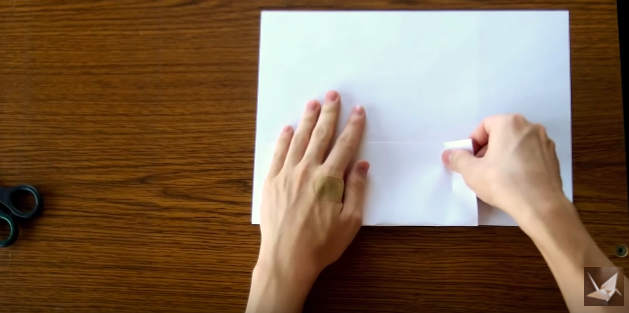 Comienza con un trozo de papel de forma cuadrada, lo que quieras, fotos antiguas con tu ex, la factura vieja de la luz, etc.), gíralo para que uno de los los bordes largos quede orientados hacia ti, coloca el dedo izquierdo en la esquina superior izquierda y usa la mano derecha para acercar la esquina inferior derecha y encontrar el borde largo del papel hacia afuera. Esto debería dejarte con un triángulo doblado a la izquierda y un rectángulo vertical a la derecha. Haz un doblez donde el triángulo se encuentra con el rectángulo y corta a lo largo de ese doblez o aplica presión y desliza la uña a lo largo de él mientras está doblado y rasga.