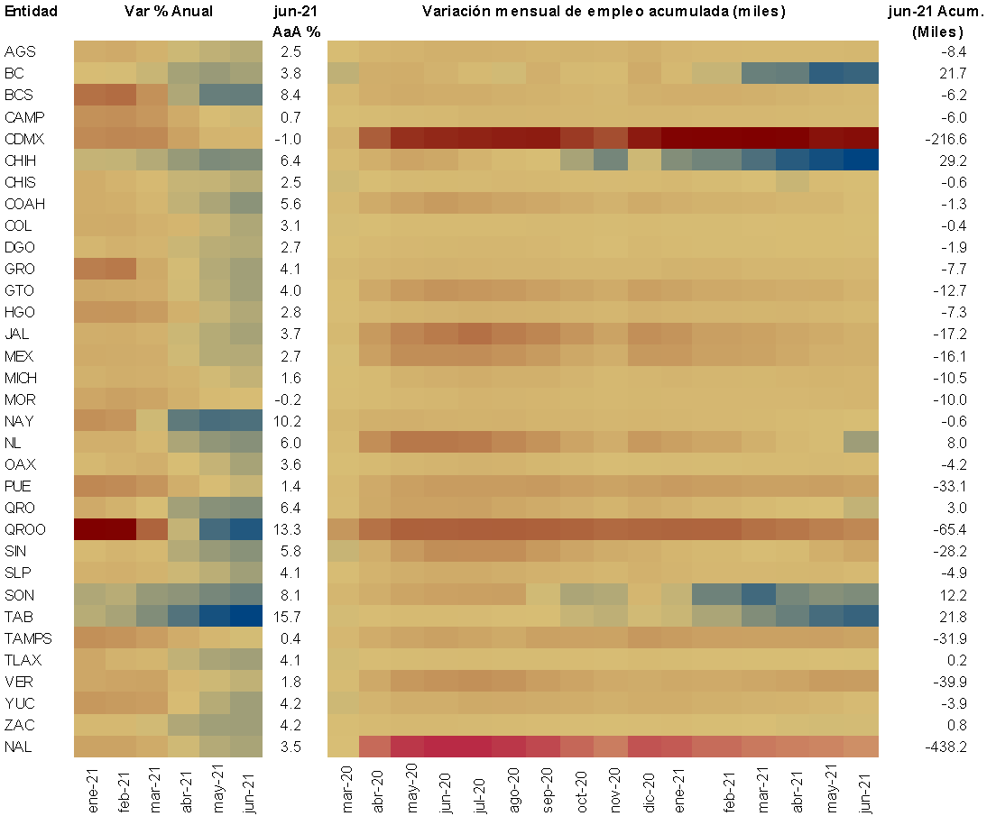 La Ciudad de México sigue siendo la entidad más afectada y pese al efecto base, continúa con tasas interanuales de crecimiento negativas y con un déficit de empleo de (-)216 mil. Quintana Roo fuertemente afectada por el descenso del turismo presentó un crecimiento interanual de (+)13.3%, sin embargo, todavía mantiene un saldo negativo de (-)65 mil empleos respecto al nivel pre-pandemia. |