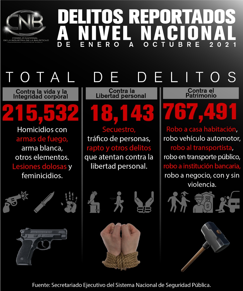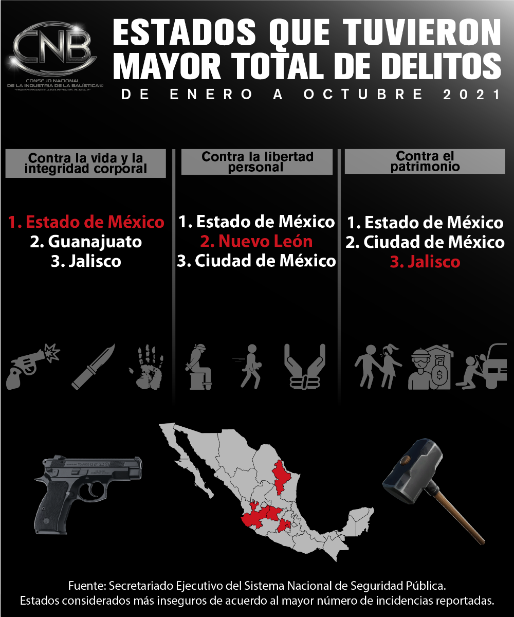 De acuerdo a las cifras del Secretariado Ejecutivo del Sistema Nacional de Seguridad Pública el total de delitos contra la vida y la integridad corporal fue de 215,532 estando en los primeros lugares el Estado de México, Guanajuato y Jalisco, el total de delitos contra la libertad personal fue de 18,143 estando en los primeros lugares el Estado de México, Nuevo León y Ciudad de México, y por último el total de delitos contra el patrimonio fue de 767,491 donde los primeros lugares estuvieron el Estado de México, Ciudad de México y Jalisco. Estos datos corresponden del periodo de enero a octubre del 2021.