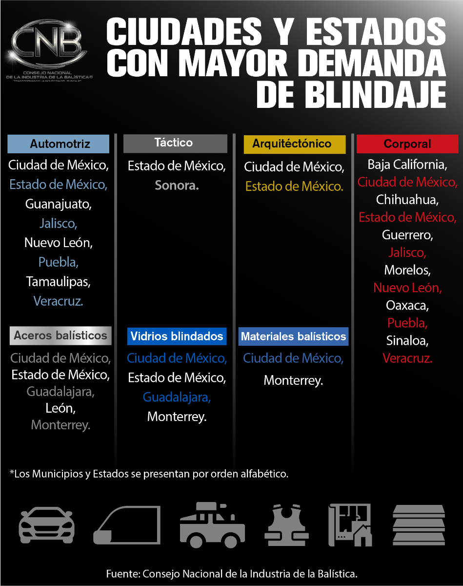 - Aceros balísticos: Se solicitaron principalmente por las empresas blindadoras de la Ciudad de México, Estado de México, Guadalajara, León y Monterrey.