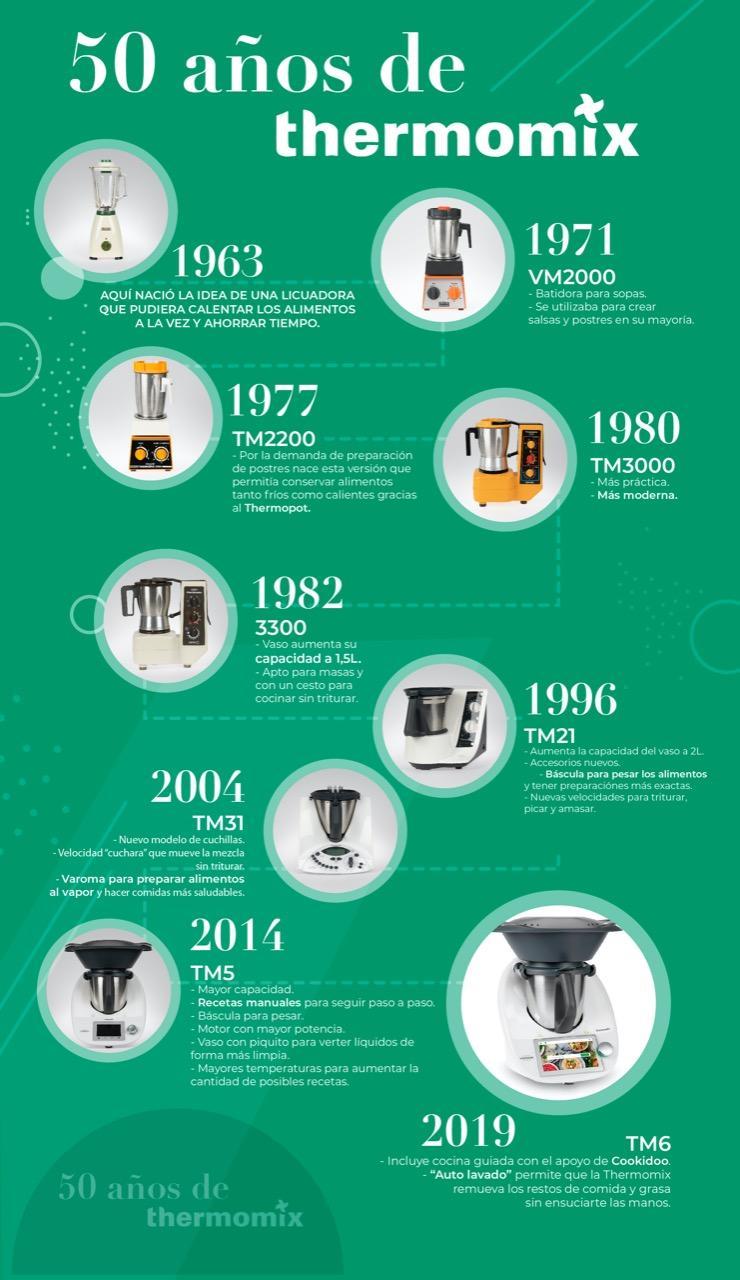 La primera Thermomix nace en 1971, con su modelo VM2000, la cual era conocida como una batidora para sopas, pero ya no sólo se utilizaba para eso, ahora también para crear salsas y postres.