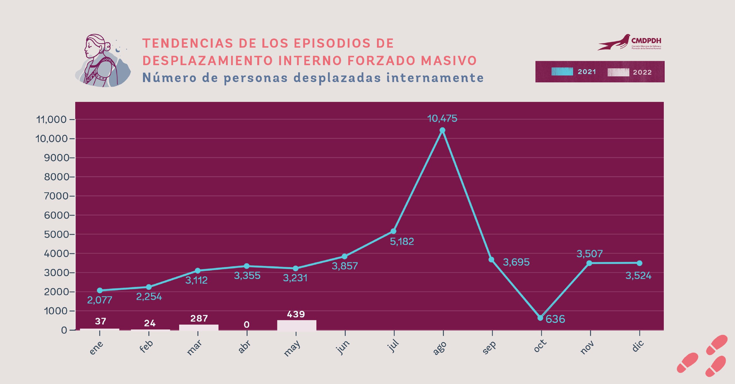 Para el caso de México, el IDMC reportó que en 2021 unas 18,700 personas fueron forzadas a huir de sus hogares y desplazarse internamente a causa de desastres, lo que representa una disminución significativa en comparación con las 100,900 personas registradas en 2020. Con relación a los desplazamientos causados por conflictos y violencia, el IDMC reportó la cifra registrada por la CMDPDH: alrededor de 29,000 personas, cantidad que triplica la registrada en 2020.