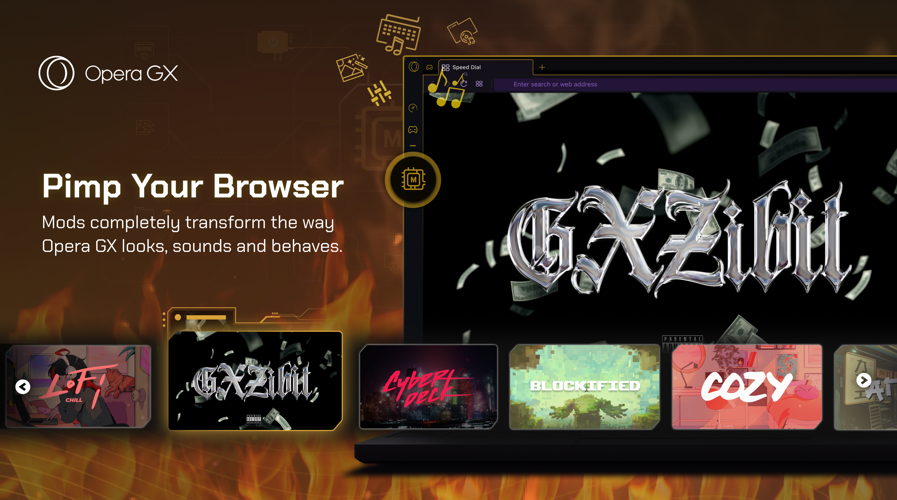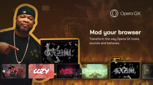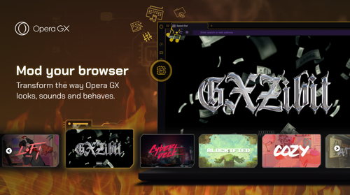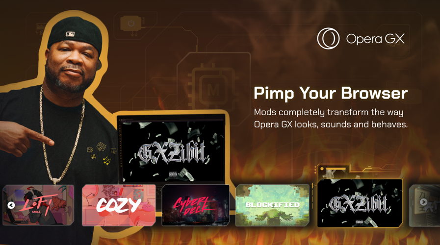 Por otro lado, Opera GX ha lanzado GX Mod Store, donde los usuarios pueden encontrar docenas de Mods prediseñados, inspirados en juegos o en la comunidad de jugadores. Estos Mods utilizan diferentes temas o estados de ánimo, sonidos y skins totalmente únicos. Algunos ejemplos de estos Mods prediseñados incluyen Cyberdeck, Anime, LoFi Chill, Blockified, Drive-by y Legendary Rift. También se encuentra GXzibit, un Mod creado exclusivamente por Xzibit e inspirado en el hip hop de los años 2000.
