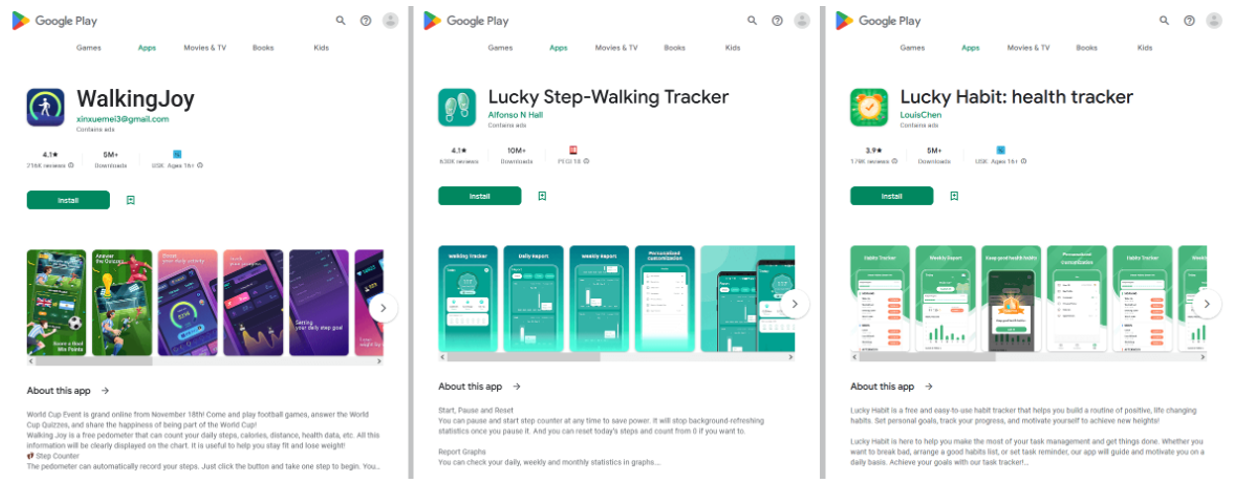 Un estudio publicado a principios de 2023 reveló varias aplicaciones sospechosas en Google Play con más de 20 millones de descargas entre ellas. Estas apps se anunciaban principalmente como monitores de salud y prometían a los usuarios recompensas en efectivo por caminar y otras actividades, así como por ver anuncios o instalar otras aplicaciones. Más concretamente, el usuario recibía puntos por realizar estas acciones, que supuestamente podían convertirse después en dinero real. El único problema era que para obtener una recompensa era necesario acumular una cantidad tan grande de puntos que en la realidad era imposible lograrlo. |