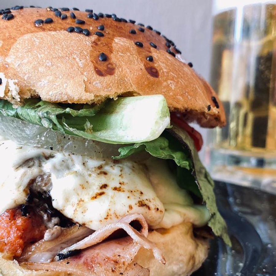 hamburguesa preparada con carne de res, echalote crujiente, tocino,